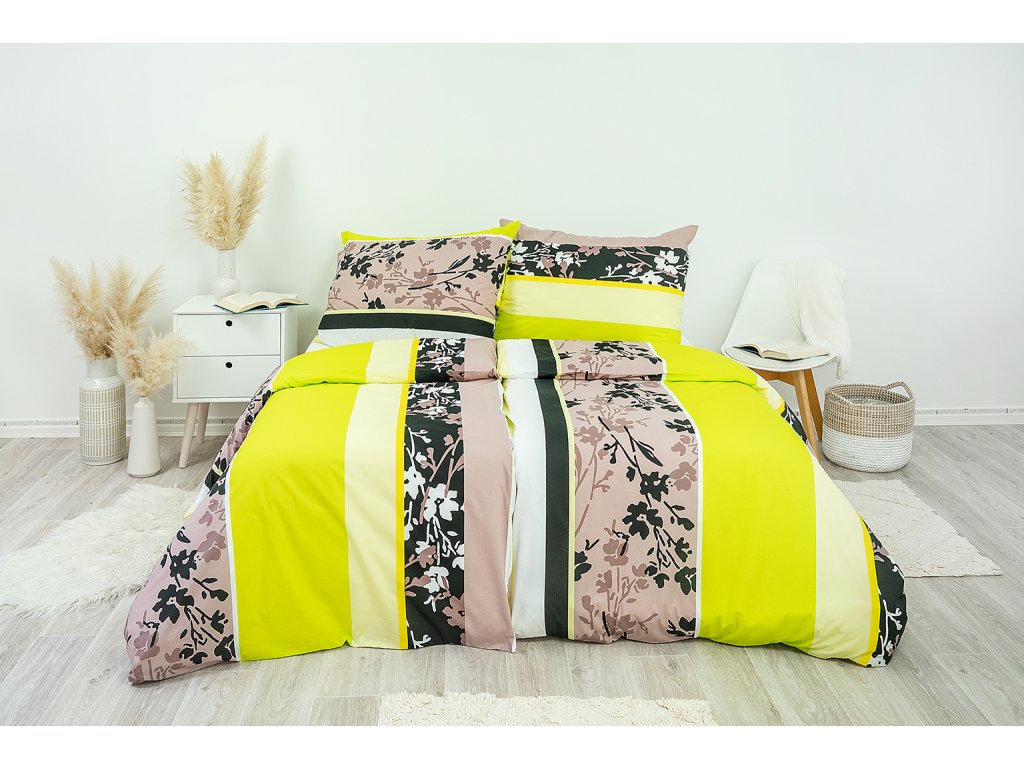 Bavlněné povlečení dream je okouzlující díky rafinované kombinaci geometrie a květin. Vzor kombinuje černou, bílou, hnědou (kapučíno), žlutou a zelenou barvu. Toto povlečení si zamilujete na první pohled. Povlaky na polštáře 90x70 a na malé polštářky 40x40 cm jsou šité z metráže, kvůli rozmanitosti vzoru je každý jiný.