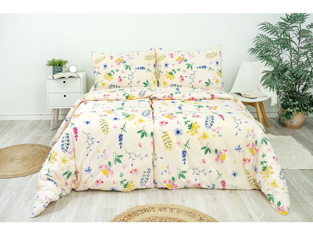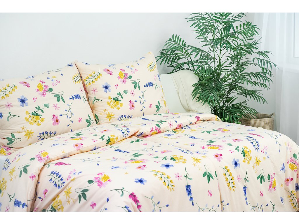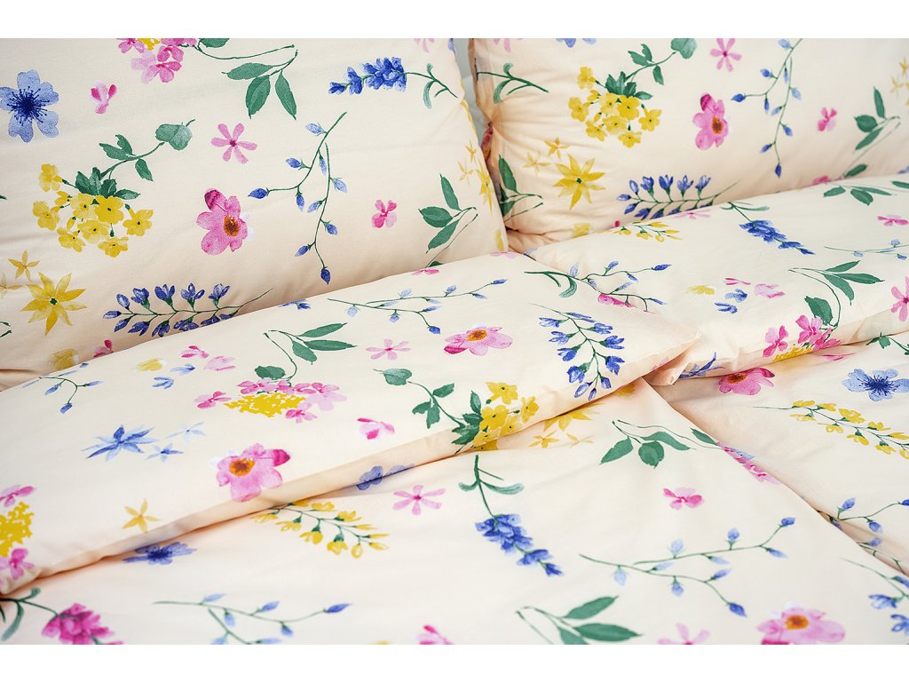 Romantický květinový vzor na meruňkovém podkladu tvoří unikátní design tohoto bavlněného povlečení. Půvabný květinový motiv vnese do vaší ložnice pocit svěžesti a čistoty. Povlaky na polštáře 90x70 a na malé polštářky 40x40 cm jsou šité z metráže, díky rozmanitosti vzoru je každý jiný.