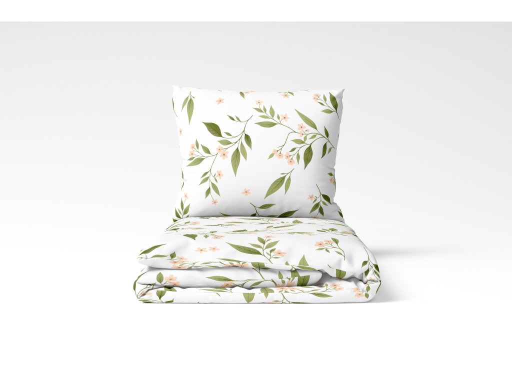 Vneste do své ložnice svěžest a klid přírody. Toto kvalitní bavlněné povlečení s jemným vzorem zelených lístků a drobných růžových kvítků dodá interiéru nadčasový, elegantní styl. Materiál ze 100% bavlny je příjemný na dotek, prodyšný a snadno se udržuje. Zapínání na zip je praktické a zajišťuje pevné uchycení přikrývky.