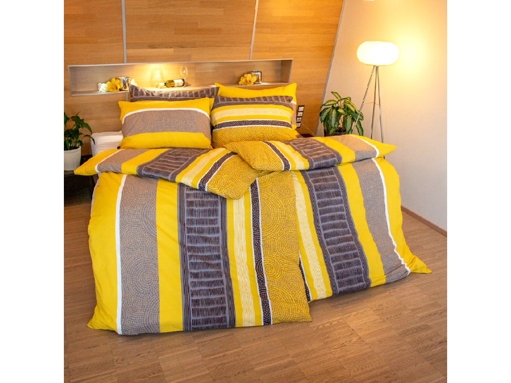 Elegantní povlečení z bavlny v nápaditém designu. Ocení jej především ti, kteří mají rádi hnědou a žlutou barvu. S tímto povlečením získá vaše ložnice noblesní vzhled. Povlaky na polštáře 90x70 cm a malé polštářky 40x40 cm jsou šité z metráže, díky rozmanitosti vzoru je každý jiný.