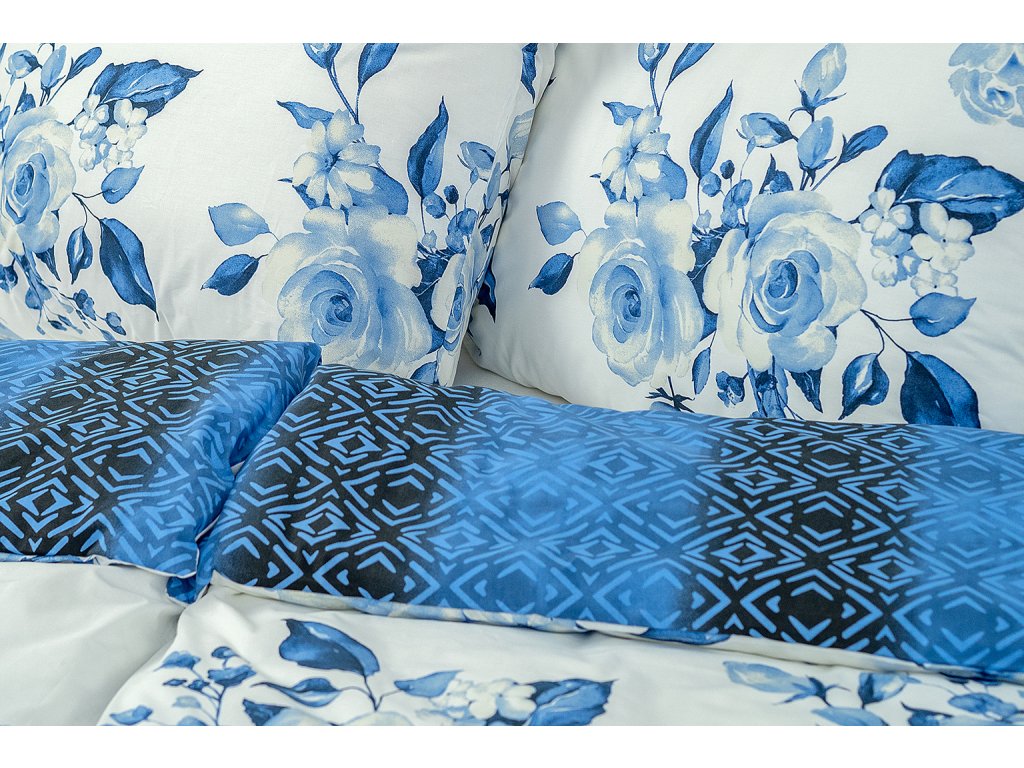 Nádherný motiv modrých růží v kombinaci černých a modrých kosočtverců si Vás získá na první pohled. Okouzlující vzor s půvabnou kombinací barev vnese do Vaší ložnice harmonii. Povlaky na polštáře 90x70 cm a malé polštářky 40x40 cm jsou šité z metráže, díky rozmanitosti vzoru je každý jiný.