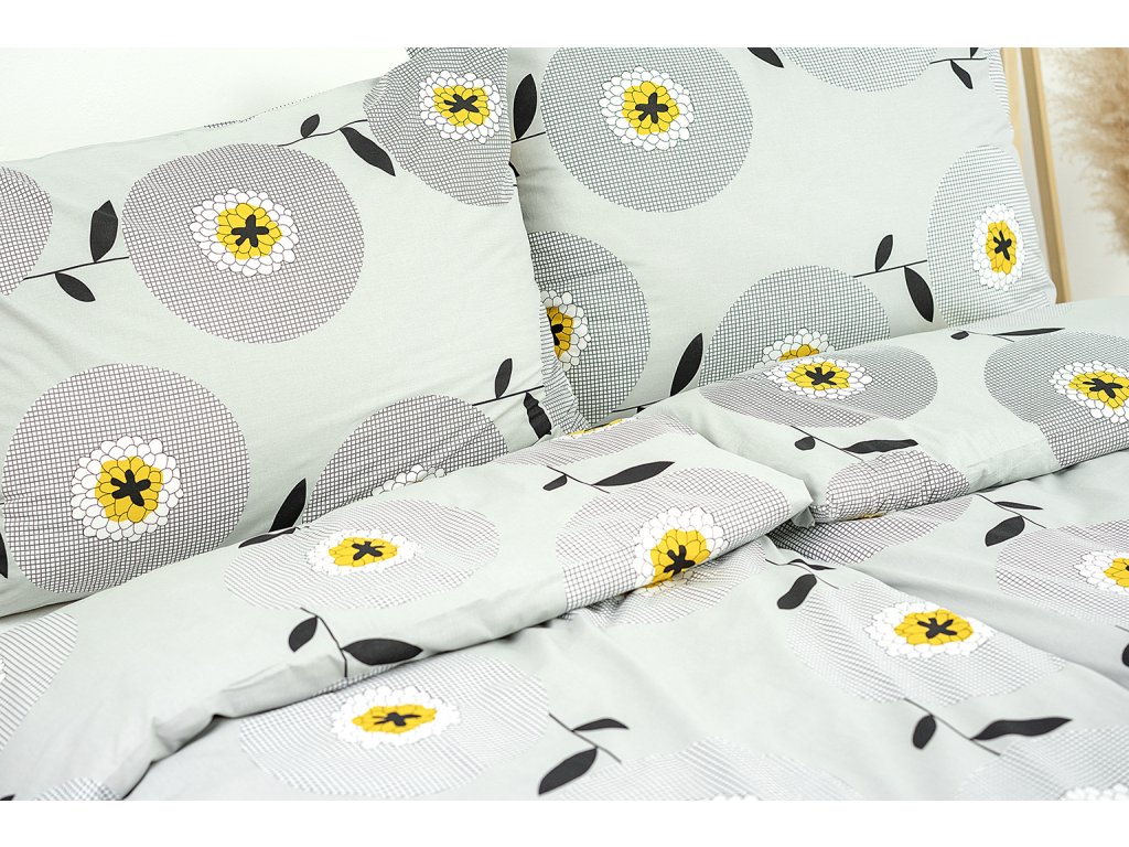 Měkoučké bavlněné povlečení v nápaditém designu. Květy na šedém podkladu se žlutými terčíky. Tento nadčasový dezén Vás zaujme svým stylovým provedením, přesto decentním vzorem.