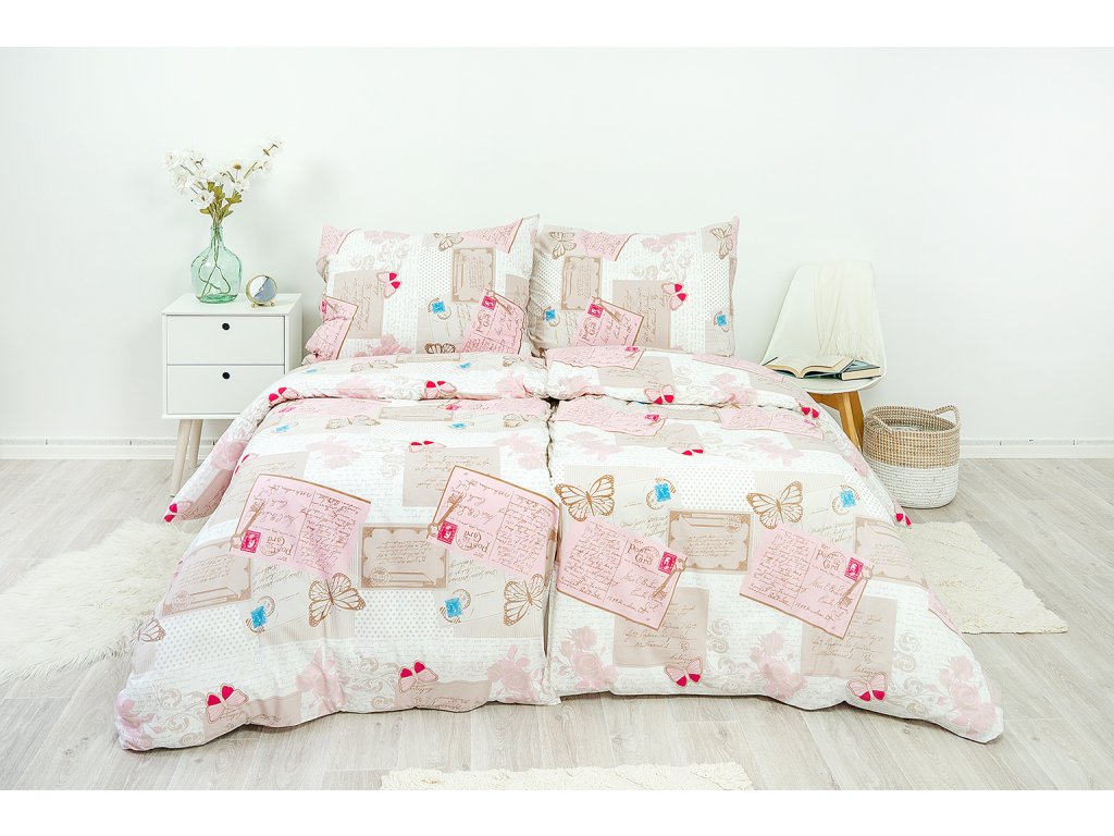 Jemné tóny růžové a hnědé barvy a lehkost vzoru se vzájemně doplňují. Toto povlečení rozzáří moderně zařízenou i rustikální ložnici.