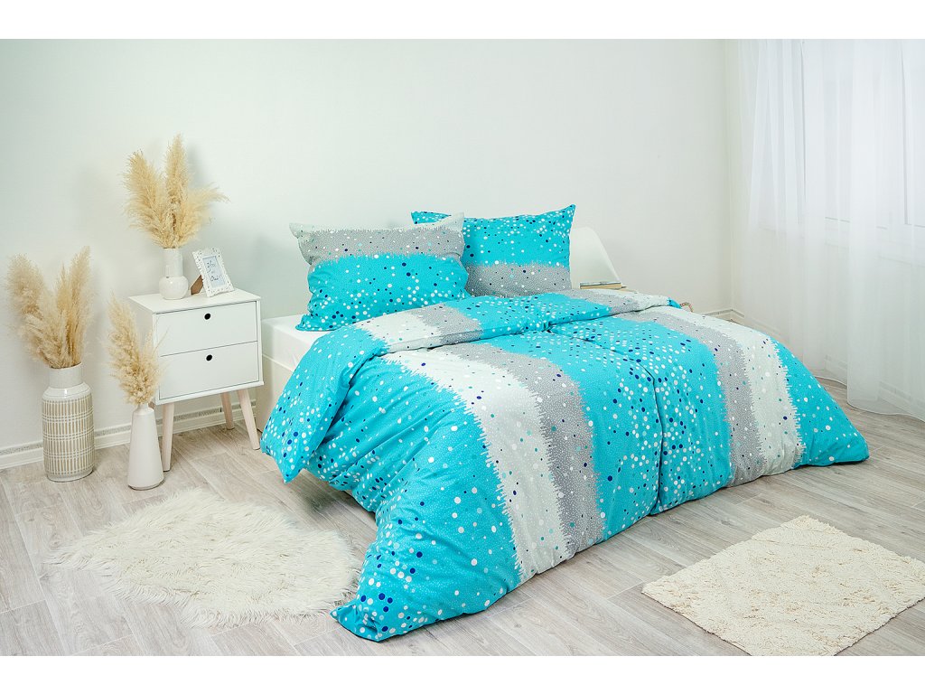 Povlečení v moderních tyrkysových, bílých a šedých odstínech a nápaditém designu. Toto stylové povlečení ocení všichni ti, co mají rádi nevšední a nadčasové vzory. Vynikne v každém interiéru. Povlaky na polštáře 90x70 a malé polštářky 40x40 cm jsou šité z metráže, díky rozmanitosti vzoru je každý jiný.