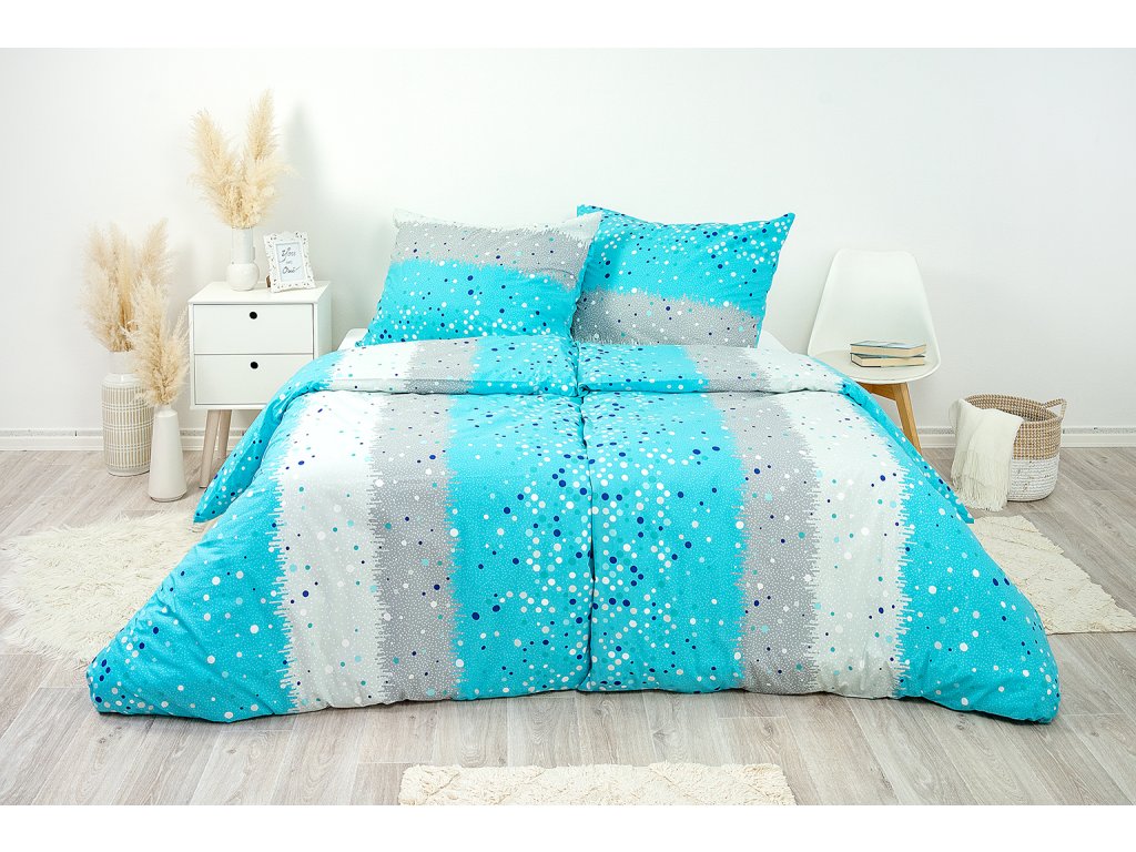 Povlečení v moderních tyrkysových, bílých a šedých odstínech a nápaditém designu. Toto stylové povlečení ocení všichni ti, co mají rádi nevšední a nadčasové vzory. Vynikne v každém interiéru. Povlaky na polštáře 90x70 a malé polštářky 40x40 cm jsou šité z metráže, díky rozmanitosti vzoru je každý jiný.