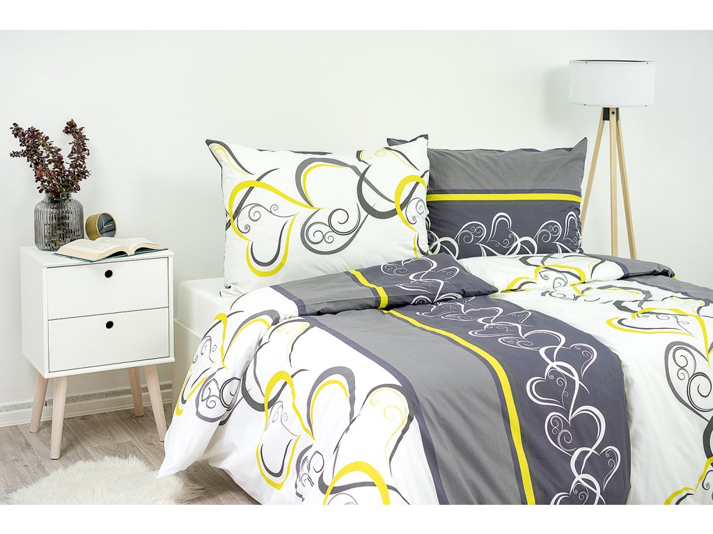 Tento dezén povlečení vnese do Vaší ložnice závan čisté elegance. Povlečení kombinuje šedou, bílou a zelenou spolu se vzorem srdcí. Povlaky na polštáře 90x70 a na malé polštářky 40x40 cm jsou šité z metráže, díky rozmanitosti vzoru je každý jiný.