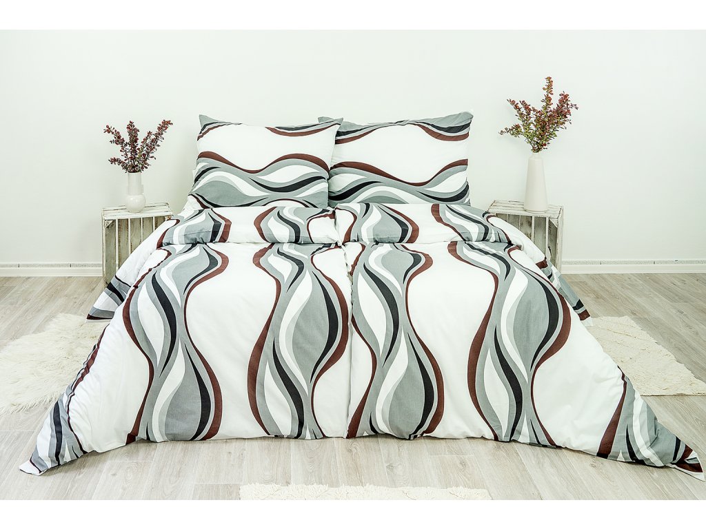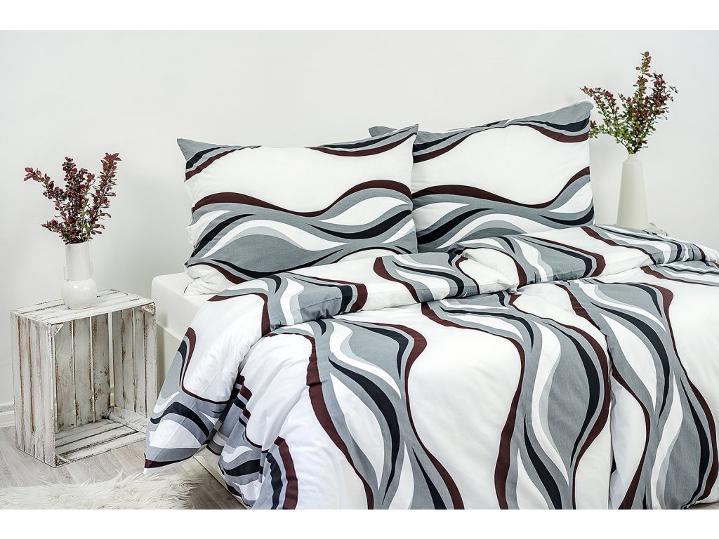 Máte svojí ložnici jednoduše zařízenou? Udělejte z postele její výrazný prvek s pomocí ložního povlečení. Bavlněné povlečení s motivem vlny, kombinuje bílou, černou, šedou a hnědou barvu. Vaše ložnice dostane nový nádech.