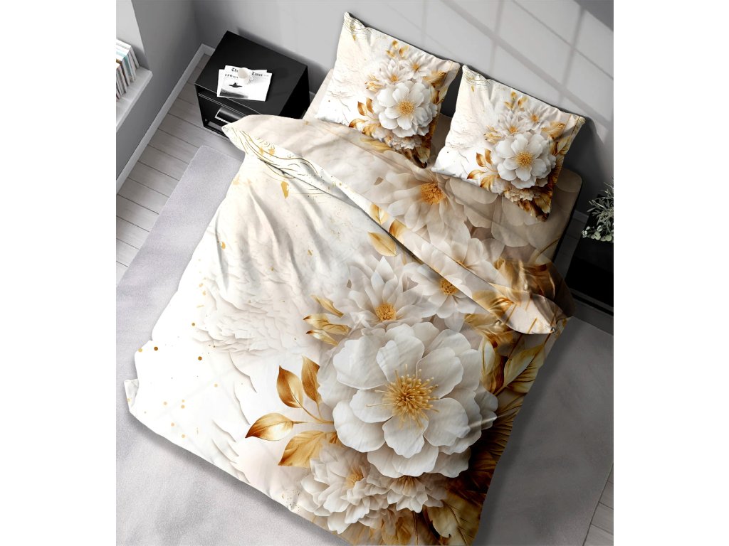 Bílé květy, jemně rozevřené jako v ranním světle, se snoubí se zlatavými lístky a vytvářejí obraz klidu a harmonie. Povlečení z hebkého bavlněného saténu vás pohladí svou jemností a dodá vaší ložnici nádech luxusu. Zapínání na zip drží vše na svém místě, zatímco vy se můžete nechat unášet do světa snů, kde vládne krása a pohodlí.
