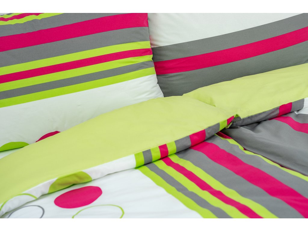 Oboustranné povlečení s motivem pruhů a puntíků v atraktivním barevném provedení, které kombinuje zelené, bílé, růžové a šedé odstíny, vnese do Vaší ložnice svěží závan energie. Vzor na tomto povlečení je z vrchní strany v podobě pruhů a puntíků, spodní strana je pouze v zelené barvě. Povlaky na polštáře 90x70 a malé polštářky 40x40 cm jsou šité z metráže, díky rozmanitosti vzoru je každý jiný.