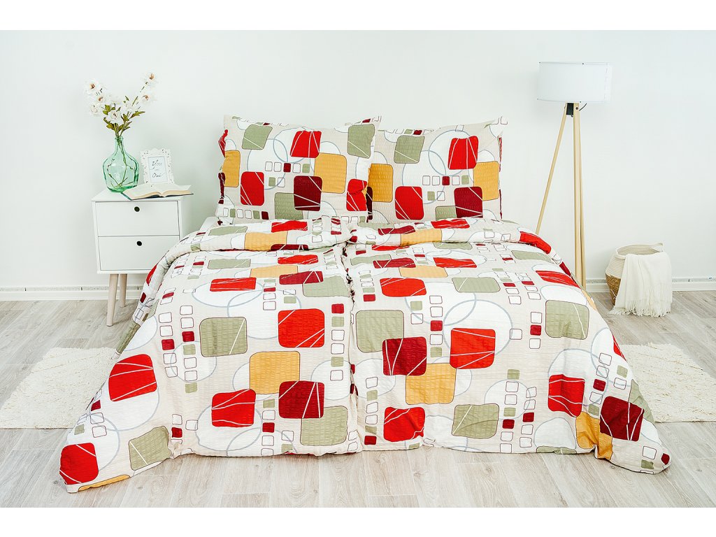 Trendy kostky cihlové, lososové, vínové a šedé barvy na světle béžovém podkladu – to je luxusní povlečení KARTY BAREVNÉ. Díky svému nadčasovému motivu se bude toto povlečení vyjímat ve všech interiérech. Polštáře i peřiny jsou z obou stran stejné.