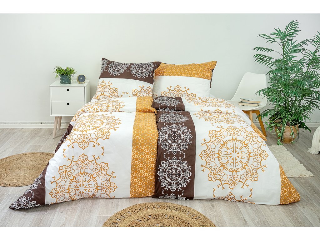 Krepové ložní povlečení s nevšedním motivem mandal zútulní každou ložnici. Kombinace hnědé, bílé a karamelové barvy vnese do vaší ložnice výjimečnost. Povlaky na polštáře 90x70 cm a malé polštářky 40x40 cm jsou šité z metráže, díky rozmanitosti vzoru je každý jiný.
