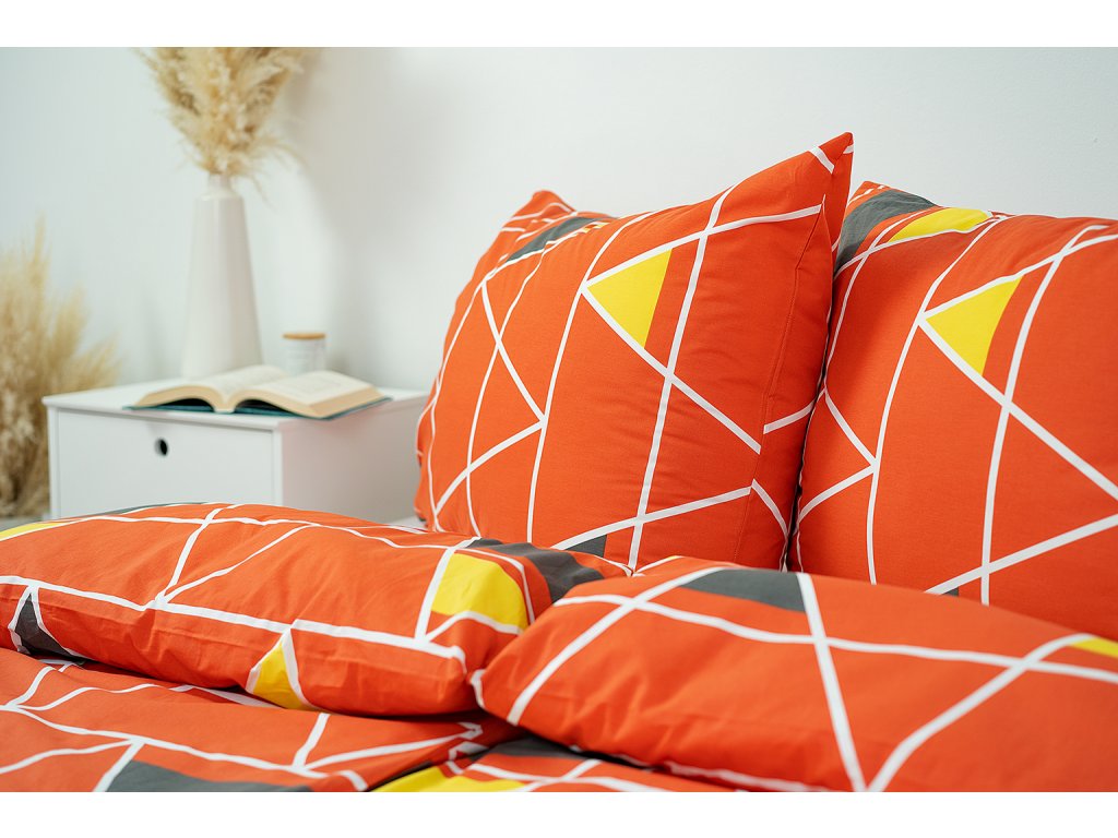 Krepové povlečení pyramidy červené Vás zaujme na první pohled jednoduchým zpracováním a nápaditou kombinací barev. Povlaky na polštáře 90x70 cm a polštářky 40x40 cm jsou šité z metráže, díky rozmanitosti vzoru je každý jiný.