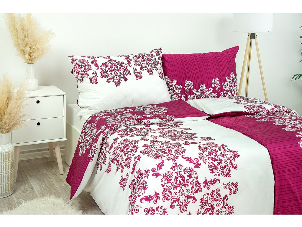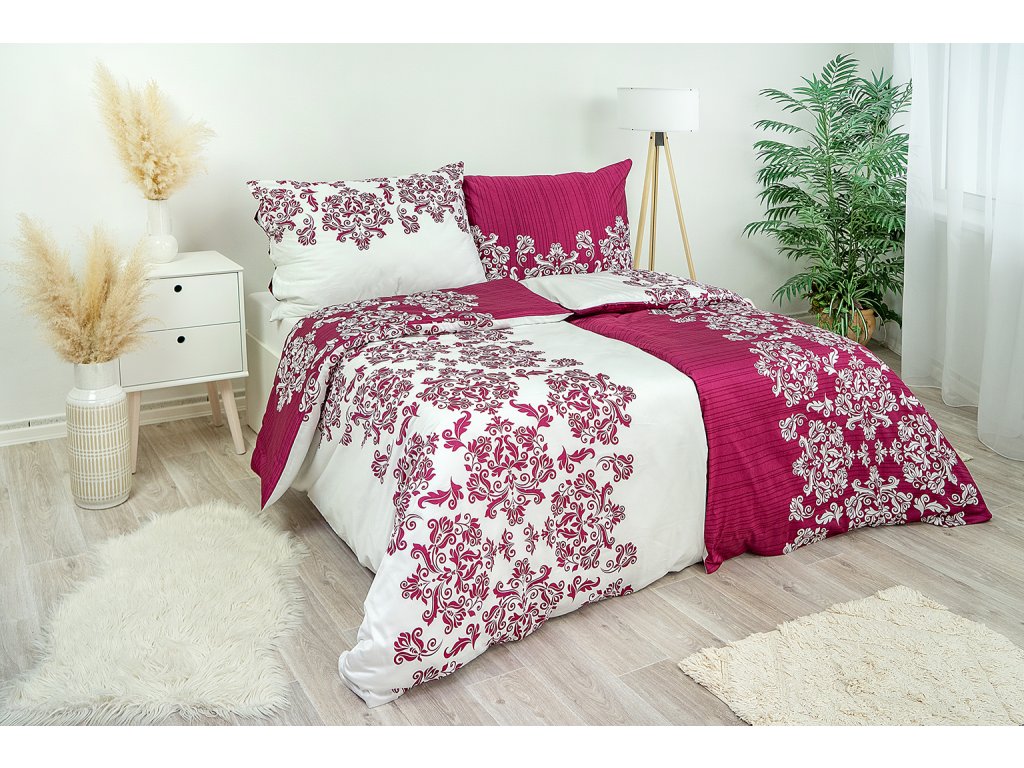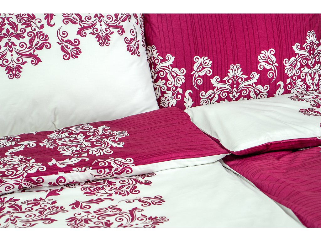 Rafinovanost a působivý design na dokonale sladěném oboustranném povlečení. S tímto oboustranným vzorem můžete libovolně měnit vzhled. Z jedné strany bílý ornament na vínovém podkladu a z druhé strany vínový ornament na bílém podkladu. Nové moderní trendy ve výrazných barvách vínové a bílé barvy vnesou energickou atmosféru do vašeho interiéru. Povlaky na malé polštářky 40x40 cm jsou šité z metráže, díky rozmanitosti vzoru je každý jiný.
