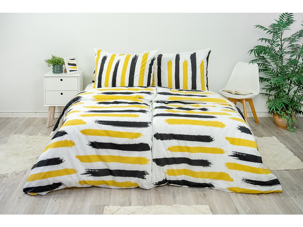 Nechte se překvapit odvážnou kombinací černých, bílých a žlutých barev. Moderní vzor pro milovníky nadčasové elegance. Nápadité a energií sálající povlečení vnese do vaší ložnice dokonalou rovnováhu. Povlaky na polštáře 90x70 cm a malé polštářky 40x40 cm jsou šité z metráže, díky rozmanitosti vzoru je každý jiný.