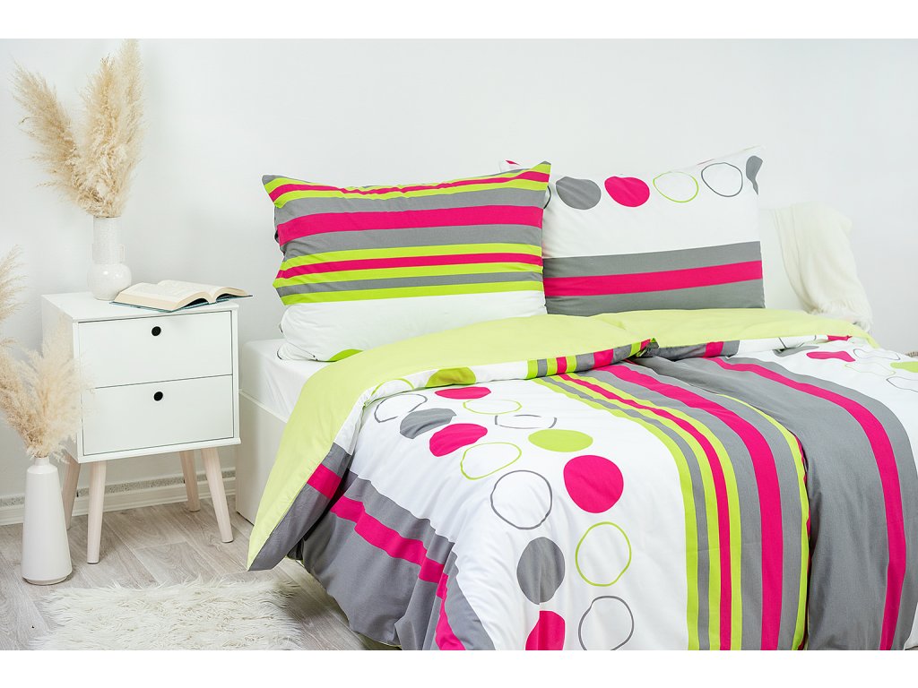 Nechte se překvapit odvážnou barevnou variací vzoru Elena. Oboustranné povlečení s motivem pruhů a puntíků v atraktivním barevném provedení, které kombinuje zelené, bílé, růžové a šedé odstíny, vnese do vaší ložnice svěží závan energie. Vzor na tomto povlečení je z vrchní strany v podobě pruhů a puntíků, spodní strana je pouze v zelené barvě. Povlaky na polštáře 90x70 a malé polštářky 40x40 cm jsou šité z metráže a kvůli rozmanitosti vzoru je každý jiný.