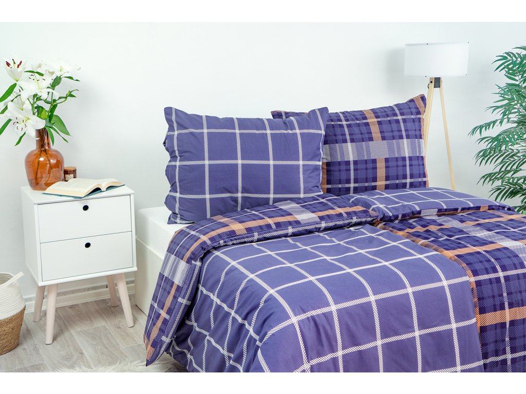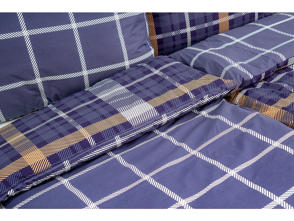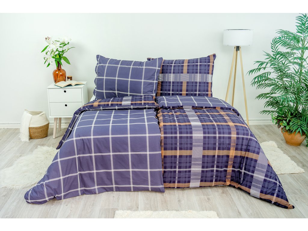 Oboustranný károvaný motiv v tmavých barvách bude ozdobou každé ložnice. Z jedné strany károvaný vzor v tmavě modrých béžových a bílých tónech, z druhé strany jednoduchá kostka v barvě tmavě modré a bílé. Díky jednoduchosti vzoru a eleganci tvoří harmonickou souhru.