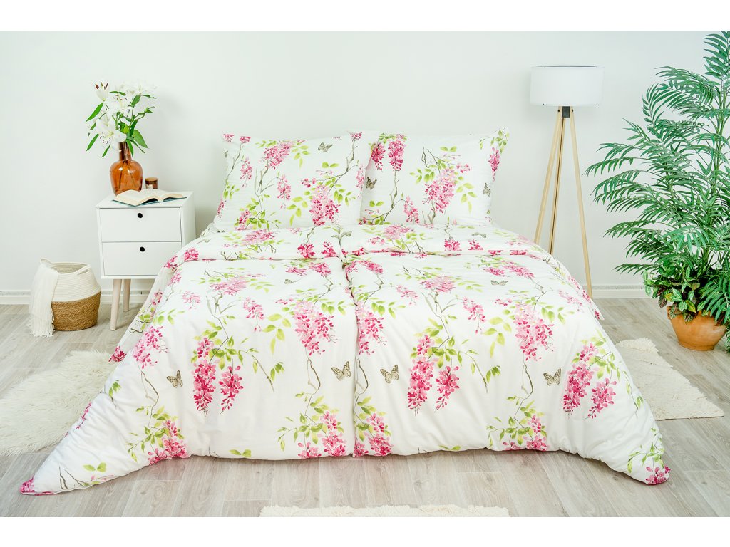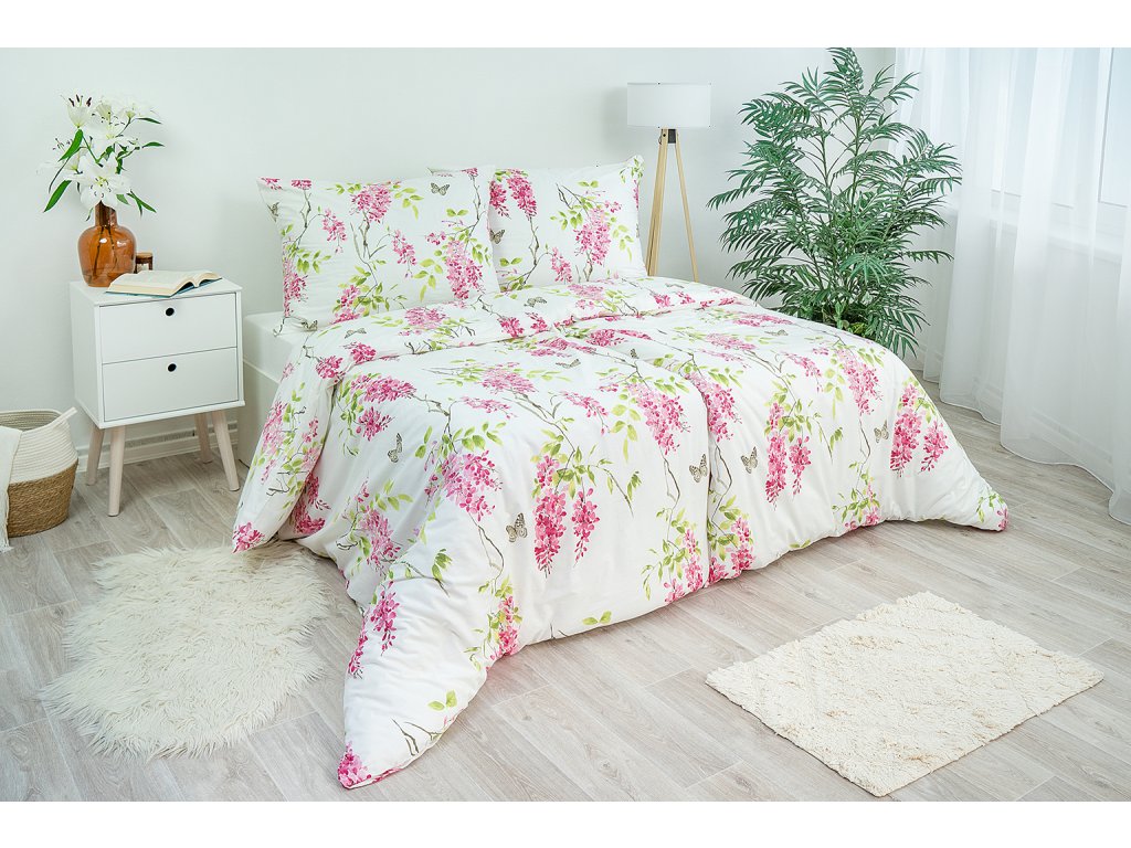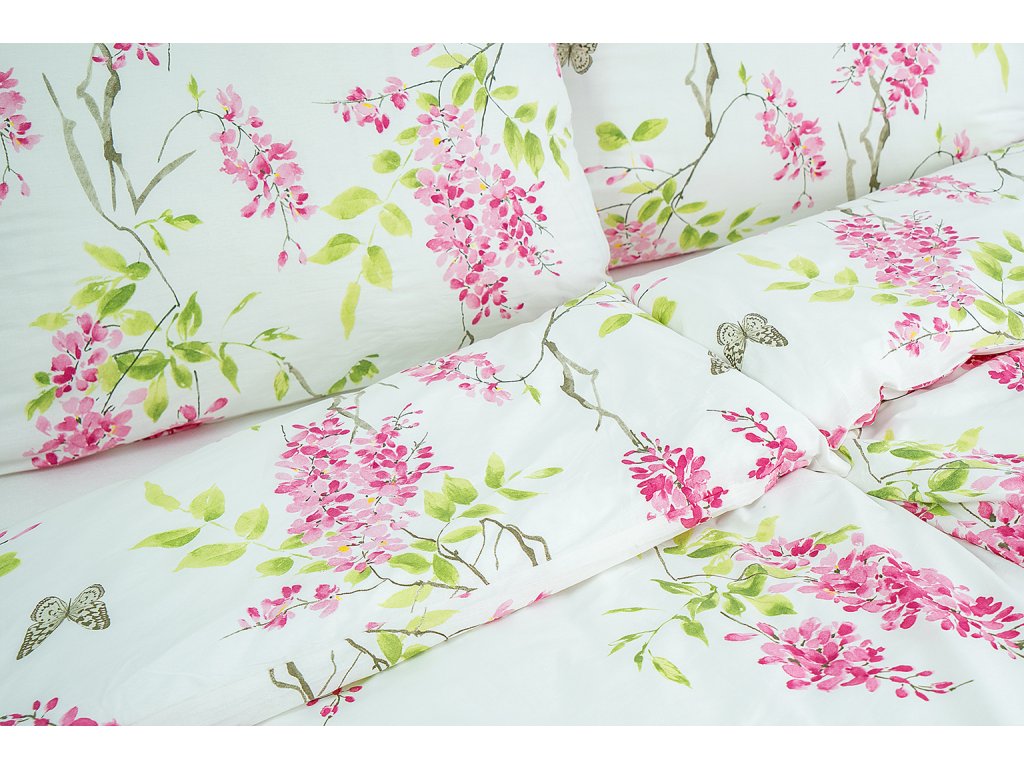 Nechte se okouzlit přírodním motivem šeříkových větviček v atraktivním barevném provedení bílých, růžových a zelených tónů. S tímto povlečením získá vaše ložnice noblesní vzhled.