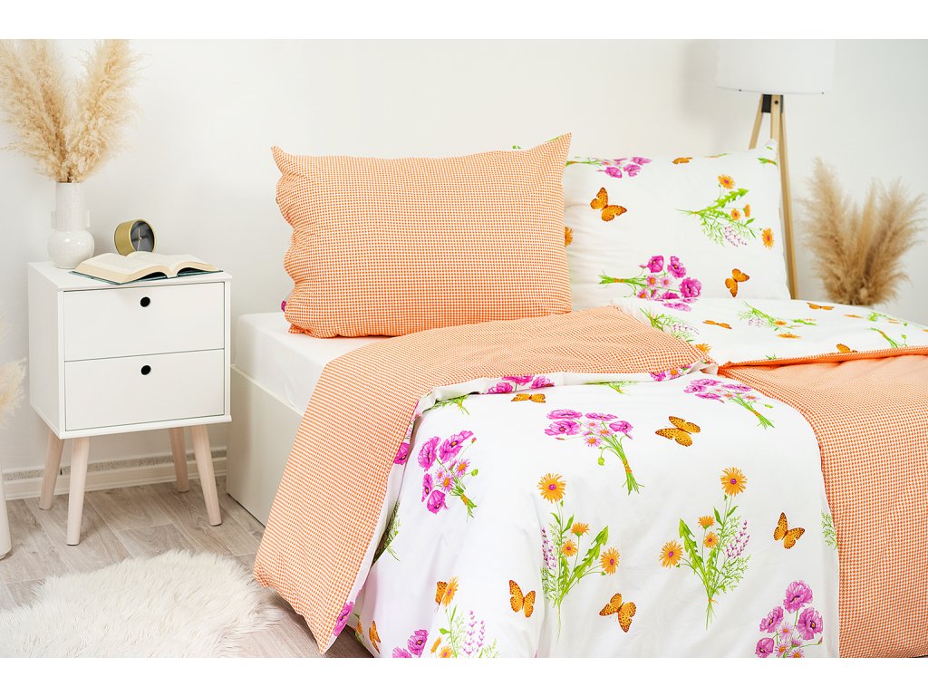 Jemný květinový vzor povlečení je jako stvořený pro jarní probuzení. Vzor květin a motýlků v kombinaci s asymetrickým vzorem je výrazným trendem tohoto jara a dodá vaší ložnici potřebnou dávku energie a optimismu. Díky oblíbenému oboustrannému provedení může být vaše postel každý den jiná. Zapojte fantazii a užijte si hravé stlaní! Povlaky na polštáře 90x70 cm a malé polštářky 40x40 cm jsou šité z metráže, díky rozmanitosti vzoru je každý jiný.