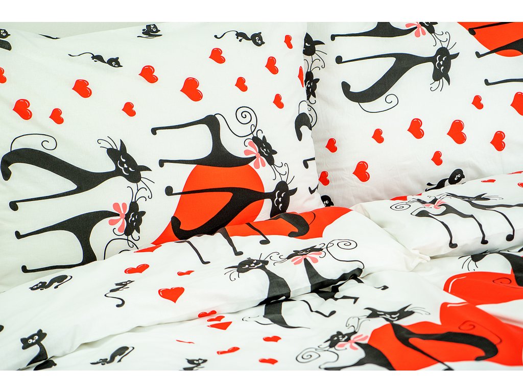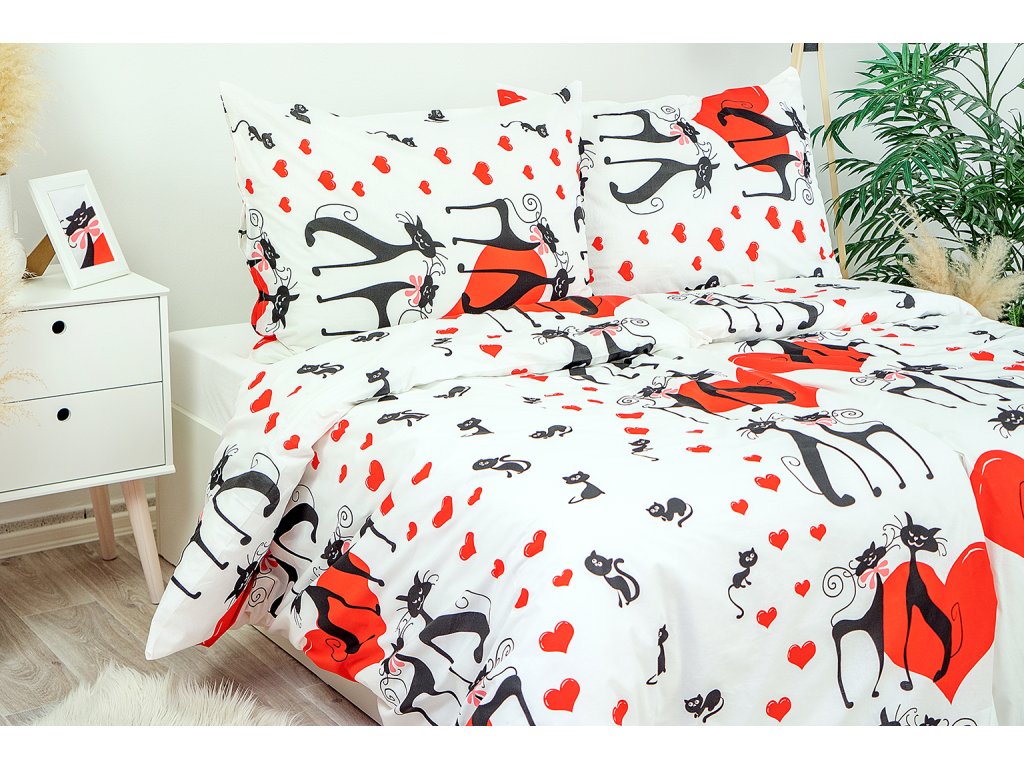 Povlečení plné energie s motivem koček a srdíček v atraktivním barevném provedení bílé, černé a červené. Povlaky na polštáře 90x70 cm a malé polštářky 40x40 cm jsou šité z metráže, kvůli rozmanitosti vzoru je každý jiný.