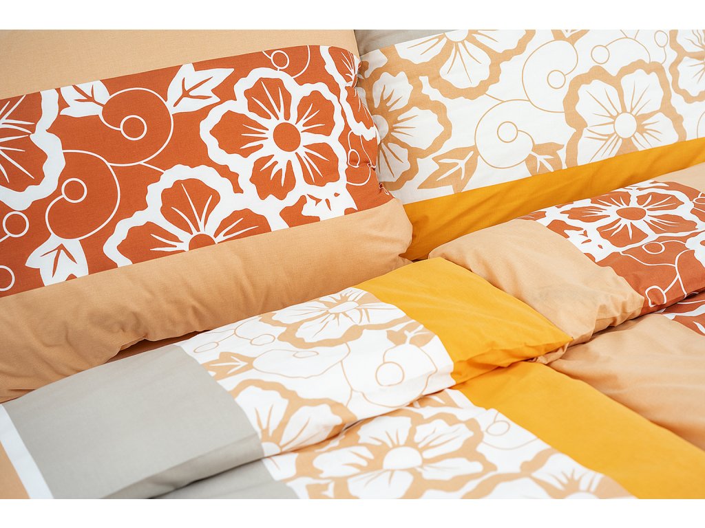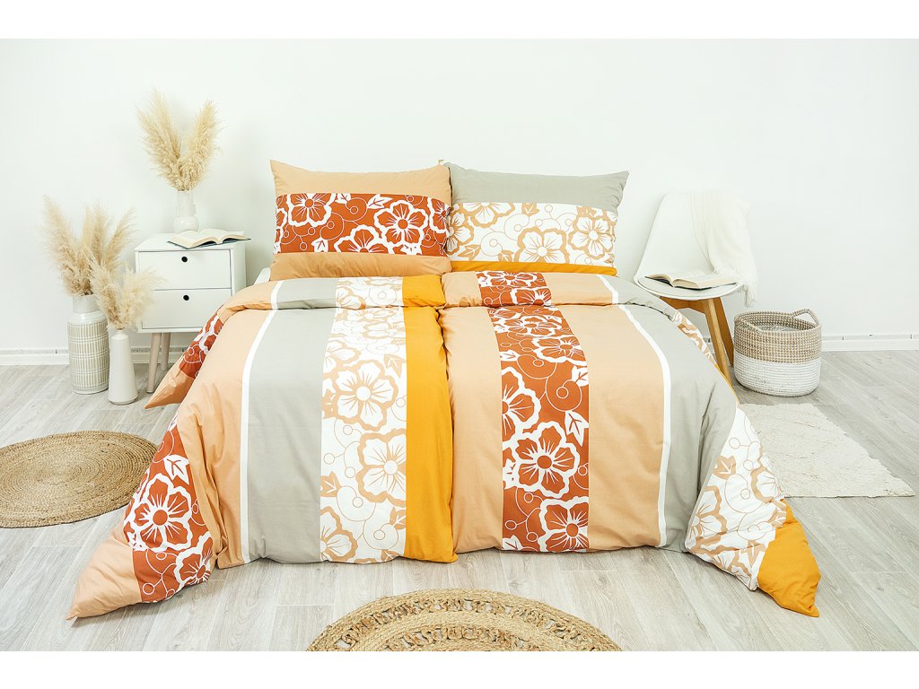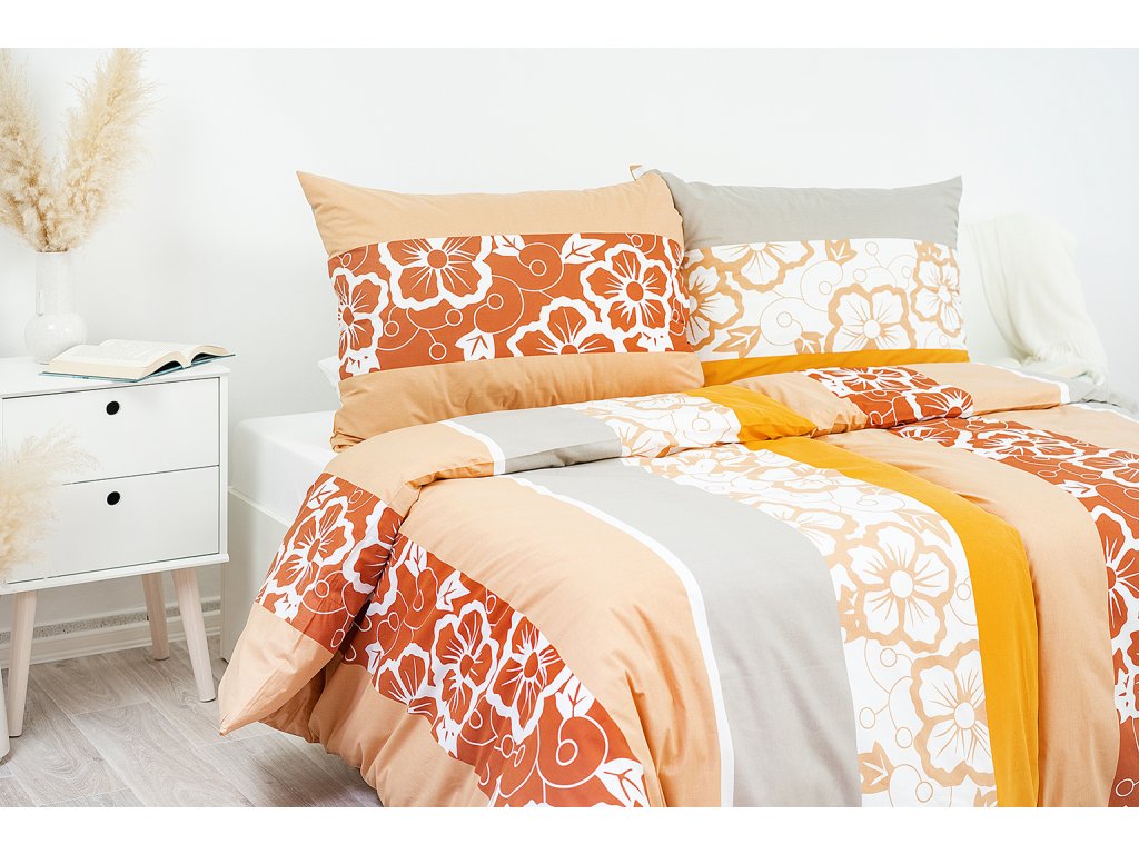 Povlečení s nevšedním spojením květinového motivu do klasických pruhů. Barvy jako oranžová, béžová, krémová, šedá a bílá společně s originálním vzorem tvoří jedinečný celek. Povlak na přikrývku i polštář je z obou stran stejný. Povlaky na malé polštářky 40x40 cm jsou šité z metráže, díky rozmanitosti vzoru je každý jiný.