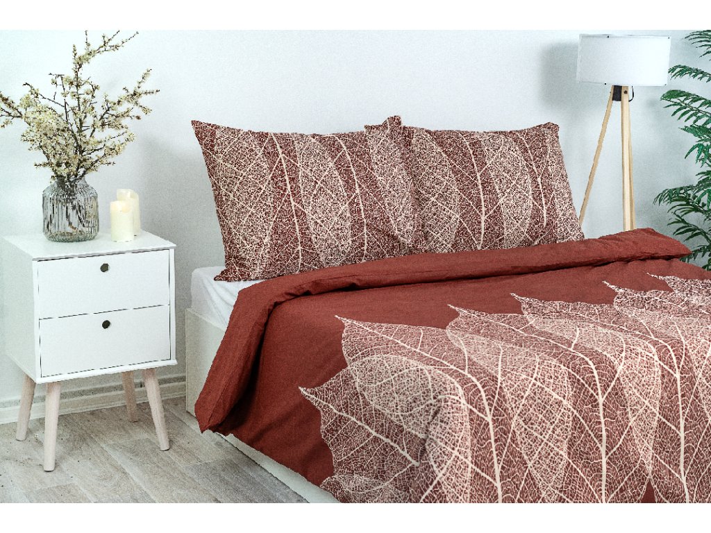 Přírodní a zemité barvy jsou nadčasové a nikdy z módy nevyjdou. Bavlněné povlečení kombinuje světlé a tmavé odstíny a přírodní motivy listů.