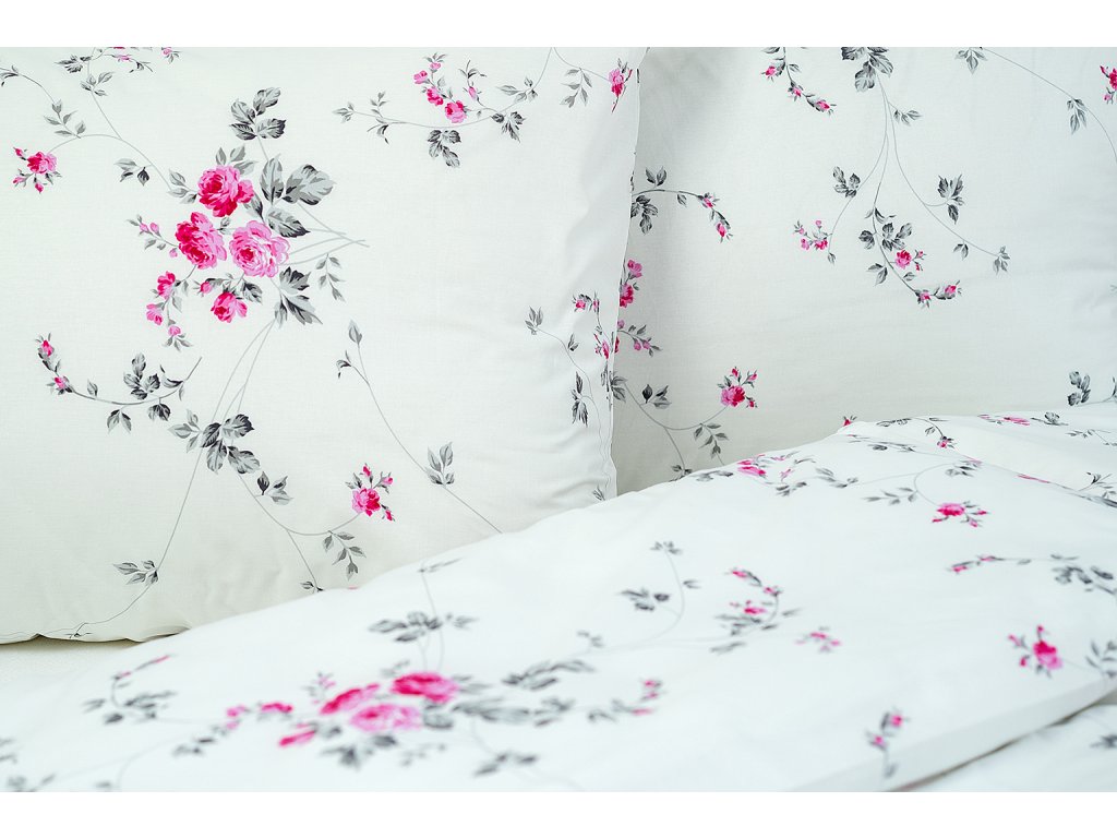 Něžný a čistotou zářící květinový motiv bude ozdobou každé romantické ložnice. Jednoduchý vzor růžových růžiček na bílém podkladu se bude vyjímat v každé ložnici.