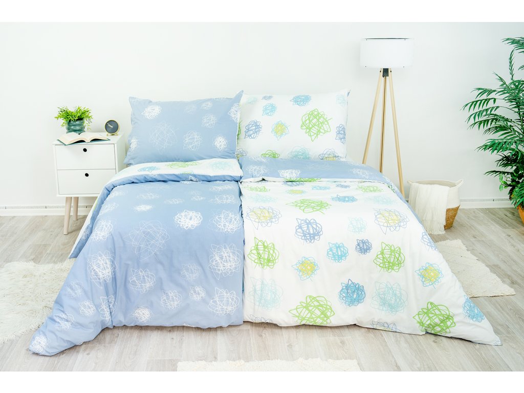 Jemné, decentní a příjemné ložní povlečení dokonale kombinuje modrou, bílou, zelenou objevujících se v motivech orbitu nebo celé plochy povlečení. Je na vás, jestli budete usínat v modré nebo barevné straně.
