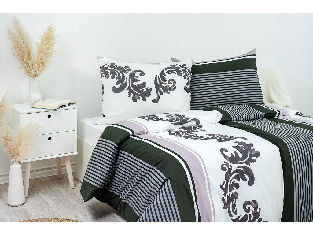 Bavlněné povlečení Zara, přináší nevšední kombinaci pruhů a ornamentu v šedých a černých odstínech na světlém podkladu. Kombinace neutrálních odstínů se svěží bílou vnese do Vaší ložnice výjimečnost. Povlaky na polštáře 90x70 a na malé polštářky 40x40 cm jsou šité z metráže, díky rozmanitosti vzoru je každý jiný.