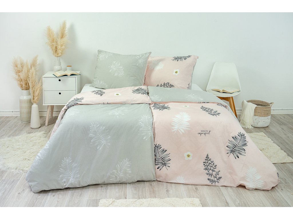Povlečení kapradí růžovo-šedé se stane stylovým doplňkem vaší ložnice. Jemné pudrové odstíny růžové a šedé se vzorem kapradí tvoří půvabný vzor. Povlaky na polštáře 90x70 cm a malé polštářky 40x40 cm jsou šité z metráže, díky rozmanitosti vzoru je každý jiný.