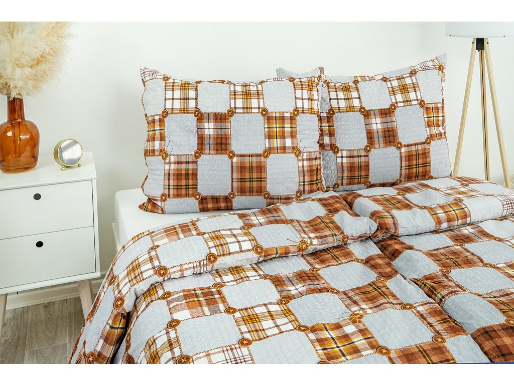 Máte rádi venkovský styl a vaše ložnice je převážně ze dřeva? Povlečte svou postel do krepového povlečení, které vypadá jako ze záplat s knoflíky. Povlečení je z krepu, odpadá vám tak nutnost žehlení.