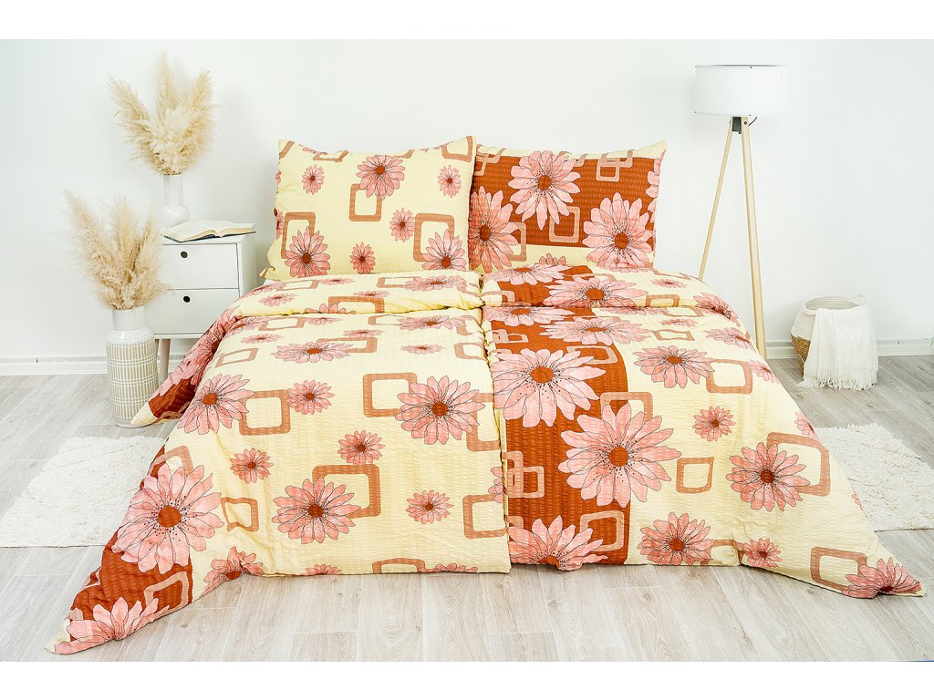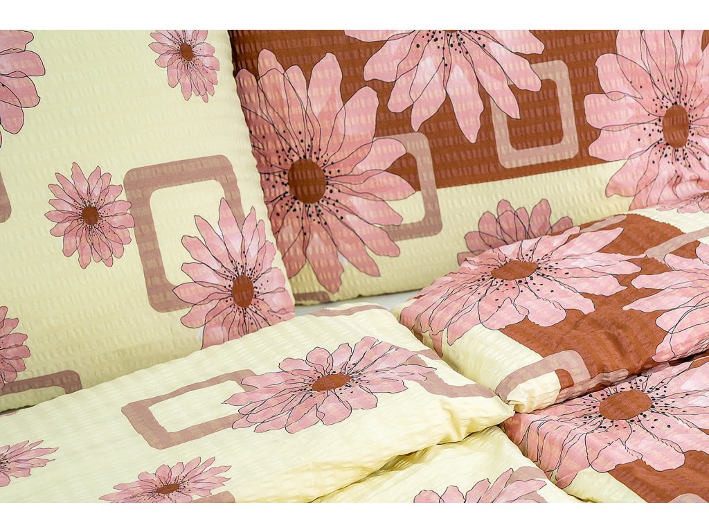 Povlečení slunečnice růžová Vás okouzlí svým jemným vzorem růžových květin na světle žlutém podkladu doplněné o čtverce v hnědé barvě. Díky svému originálnímu designu se tak povlečení stane krásnou dekorací Vaší ložnice. Povlaky na polštáře 90x70 cm jsou šité z metráže, díky rozmanitosti vzoru je každý jiný.